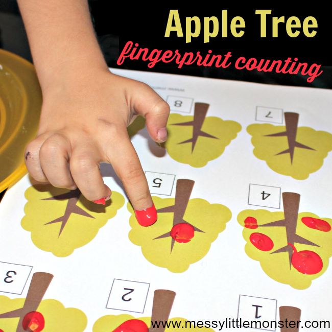 Print out this apple tree counting activity and use red fingerprints to add the correct number of apples to the trees. There are 2 printables in this set, one with numbers 1-9 and one blank for you to add your own numbers. Full details here - https://www.messylittlemonster.com/2017/09/apple-tree-fingerprint-counting-activity.html