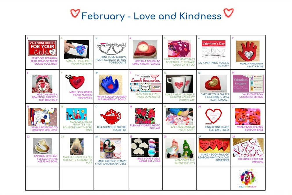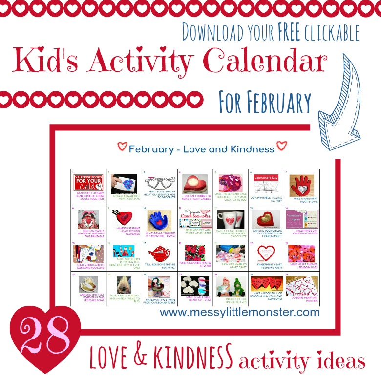 A love and kindness themed clickable activity calendar for February. Click on the images for detailed instructions of 28 fun crafts and activities for kids.