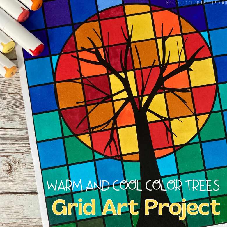 Download and print out the warm and cool color tree art template and use it to make your own grid art. Color the tree in warm colors and the background in cool colours. Full details can be found here - warm and cool color trees grid art
