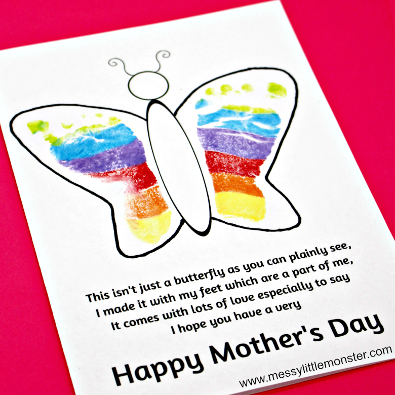 Print out the Mother's Day poem and add footprints to make a beautiful butterfly keepsake craft with the kids. This looks so cute with baby or toddler footprints. Full details of this butterfly card here - https://www.messylittlemonster.com/2018/05/footprint-butterfly-poem-printable-mothers-day-card.html