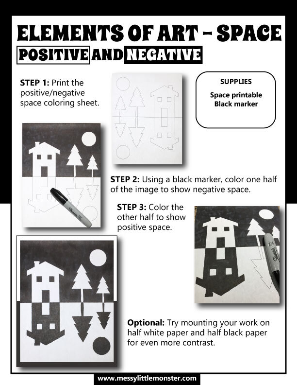 Use a black marker to color this positive and negative space worksheet. Color the negative space on the top half of the worksheet in black and then color the positive space on the bottom half in black. Full directions can be found here - Positive and Negative Space in Art