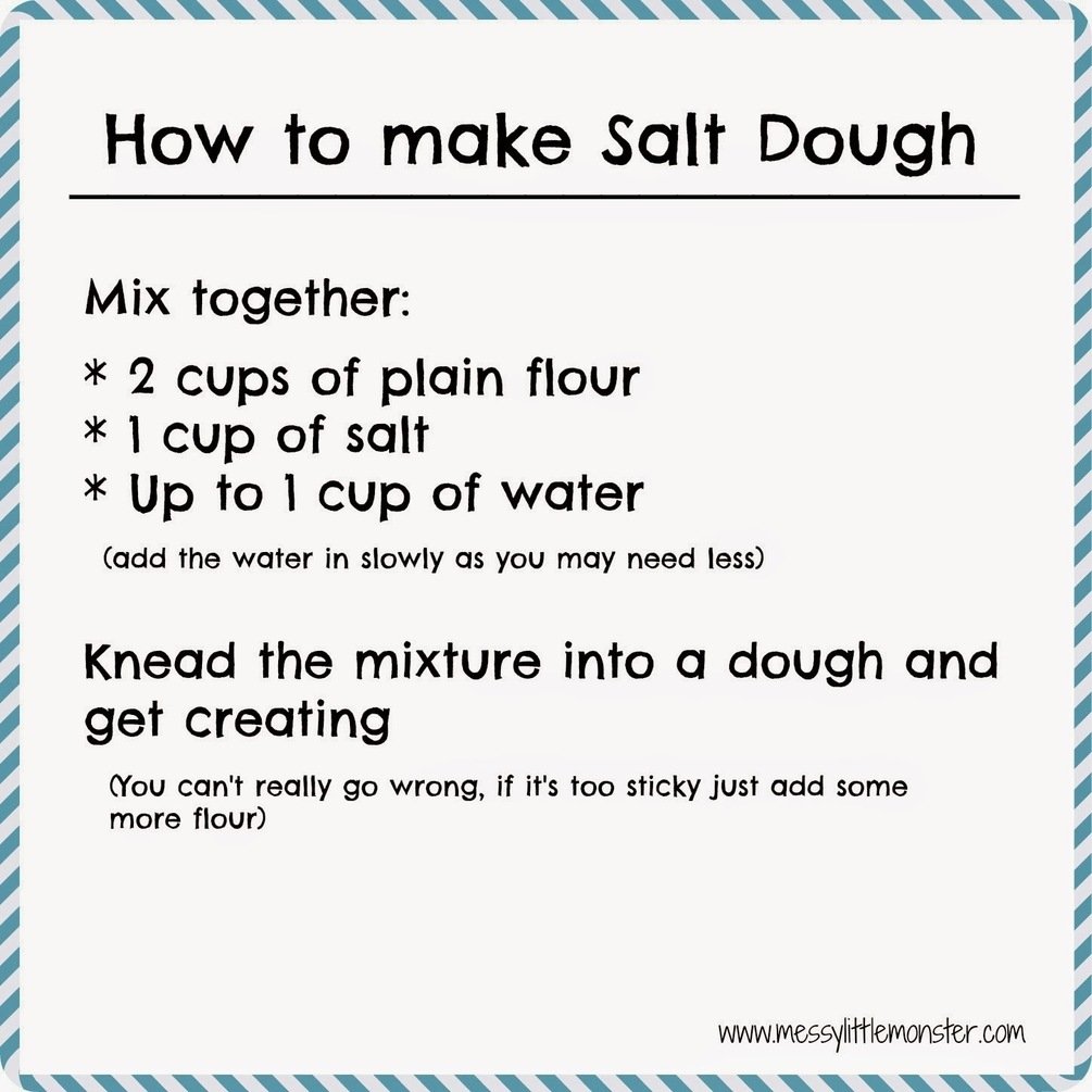 Print out this easy salt dough recipe and then head over to our salt dough recipe and craft ideas page for some salt dough craft ideas! - https://www.messylittlemonster.com/2014/12/how-to-make-salt-dough-printable-recipe.html
