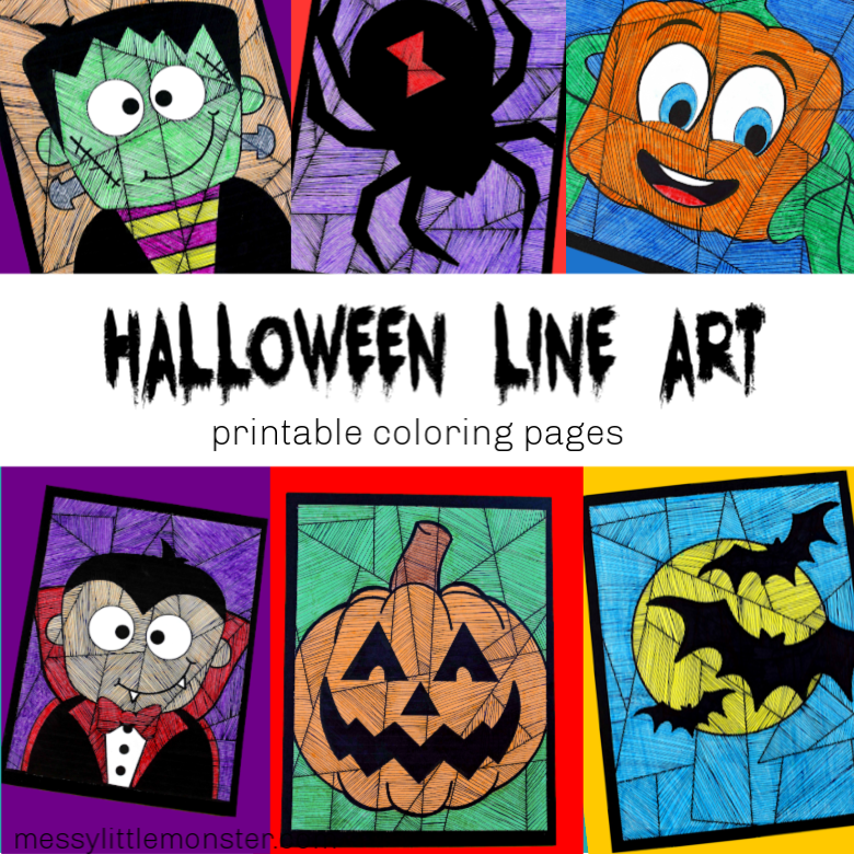 Download and print out these line art coloring pages. Use the Halloween coloring pages as they are or add line art to the different sections on the printable. This printable set makes a really fun and easy halloween craft for kids.