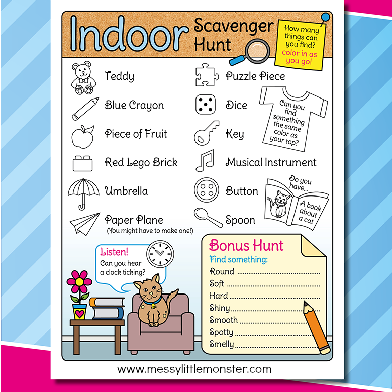 Download and print out this fun indoor scavenger hunt for kids.