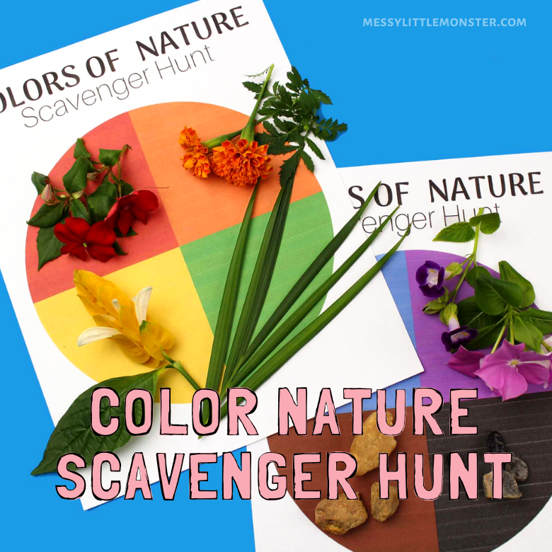 Download and print out the color nature scavenger hunt. Head outdoors and match pieces of nature to each color.