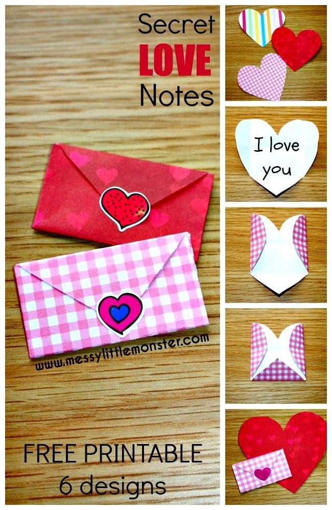 Make tiny folded heart envelopes with secret love notes written inside. Simply download and print the heart printable and then follow the full instructions here - http://www.messylittlemonster.com/2016/01/tiny-folded-heart-envelopes-love-notes.html