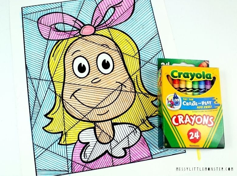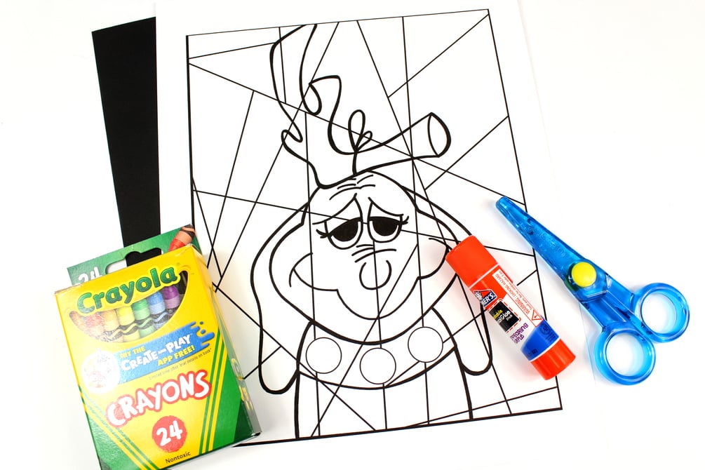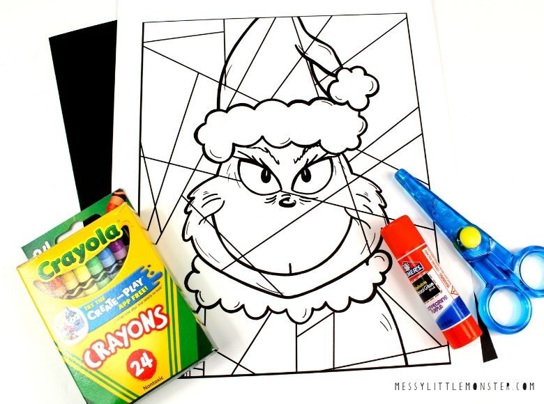 Download and print out the Grinch coloring page add lines using a black marker and then colour it with crayons to create your own Grinch picture. Cindy Lou and Max the dog are included.