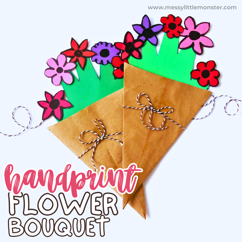 Download and print out the flower bouquet template to create a handprint flower craft. Full directions here -